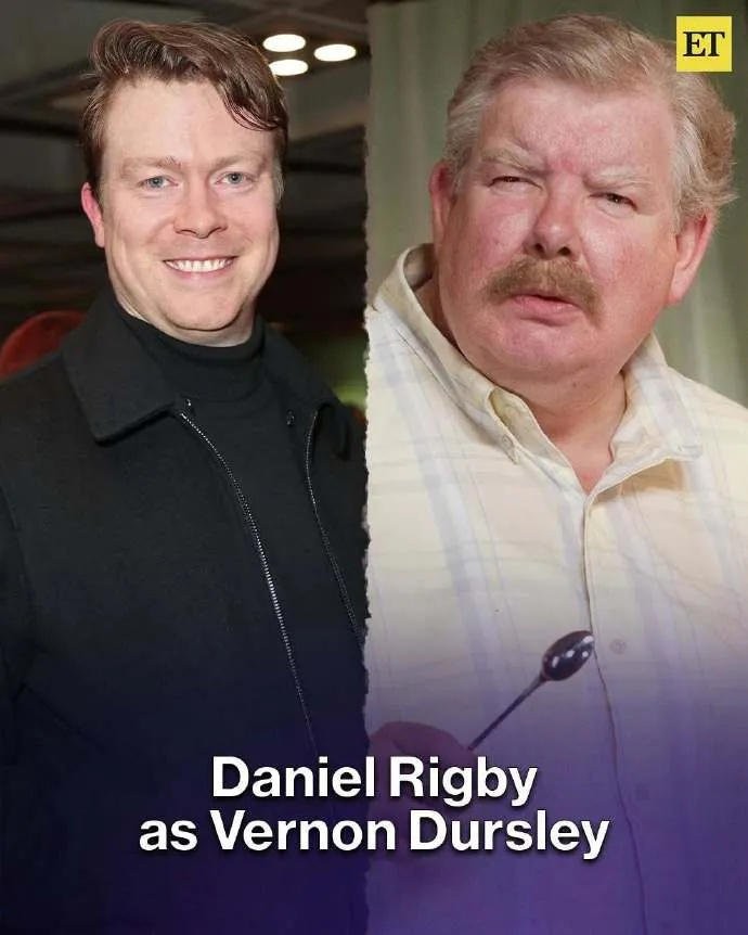 弗农·德思礼 (Vernon Dursley) 由 丹尼尔·里格比 (Daniel Rigby) 饰演,他是一位英国电视和戏剧演员,同时也是一名喜剧演员。