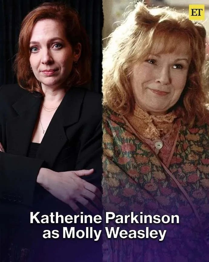莫丽·韦斯莱 (Molly Weasley) 由 凯瑟琳·帕金森 (Katherine Parkinson) 饰演,我们大多数人可能更熟悉她在英剧《IT狂人》(IT Crowd) 中扮演的珍 (Jen Barber)。